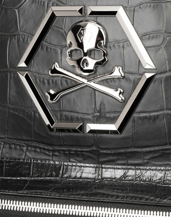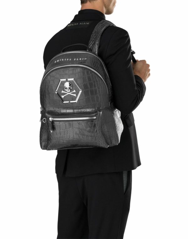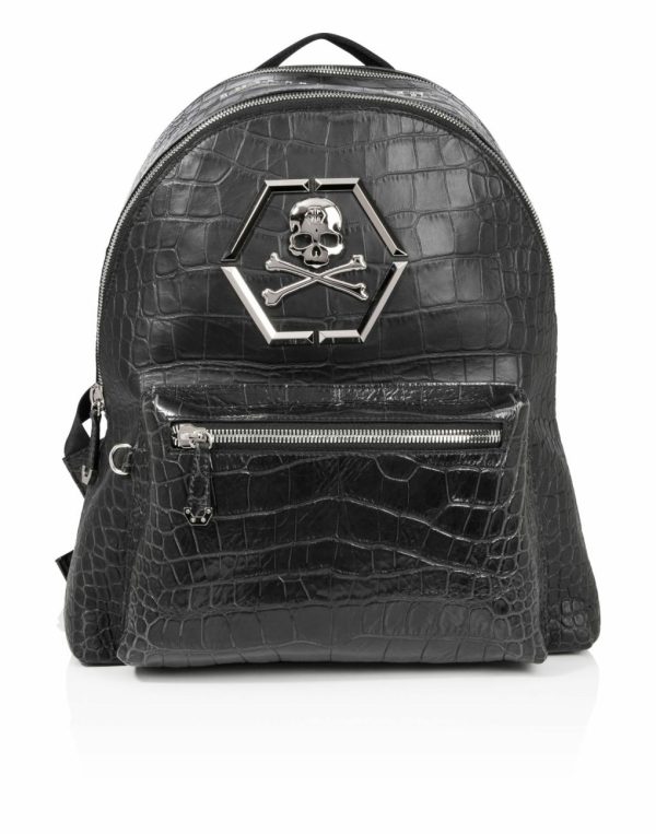 Skin crocodile pattern printed on leather backpack. Double opening with zip. Hexagonal logo placed at the front. Outside zipped pocket. Inside pocket with zip. Adjustable padded leather shoulder straps. Padded and quilted back. Carry handle. Fully lined. Measures: h 40cm, w 34cm, d 15cm.
