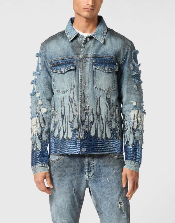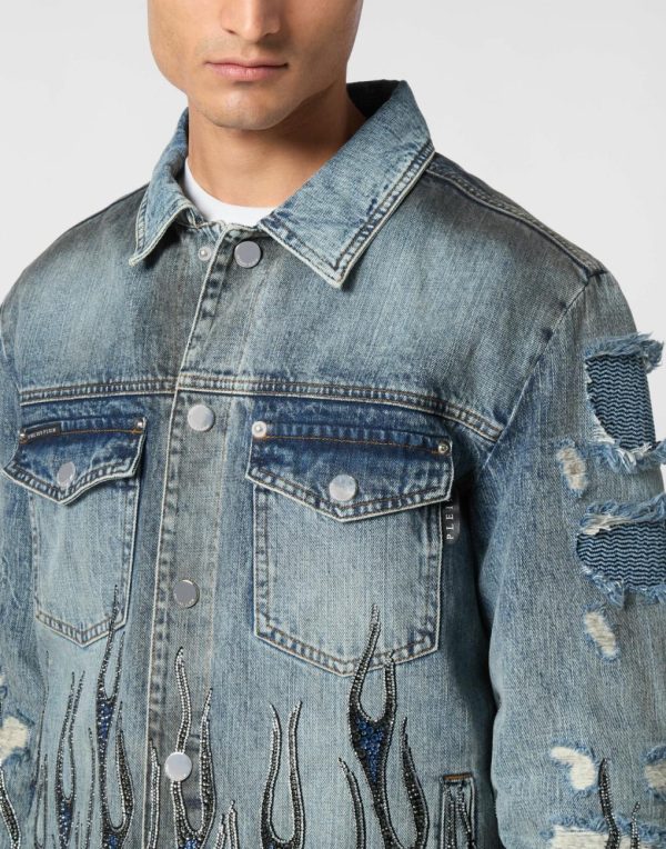 Discover the season’s new trend on this denim worker jacket featuring crystal applications and custom-made patches. Check out its distinctive details.