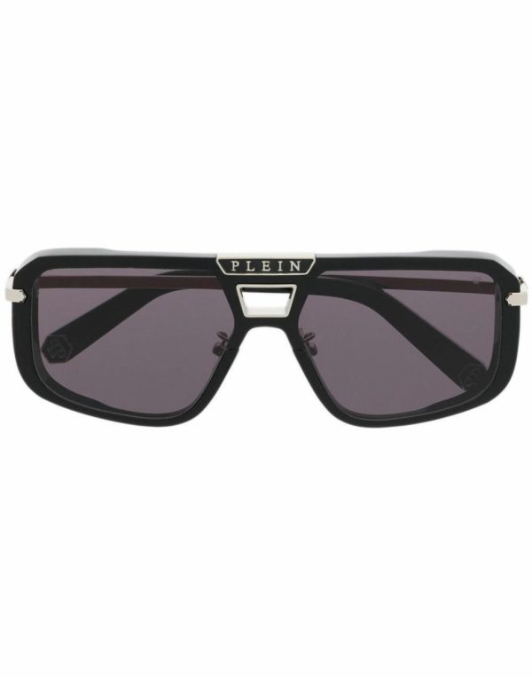 Black acetate sunglasses mask enriched with logo metal bar. Metal temples