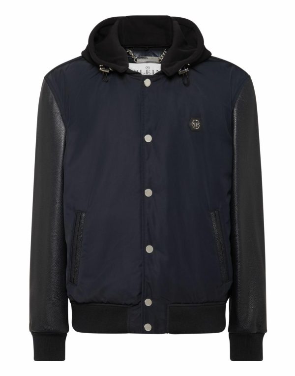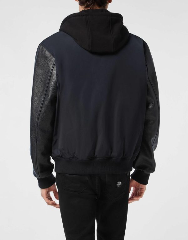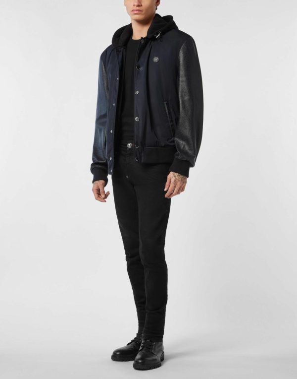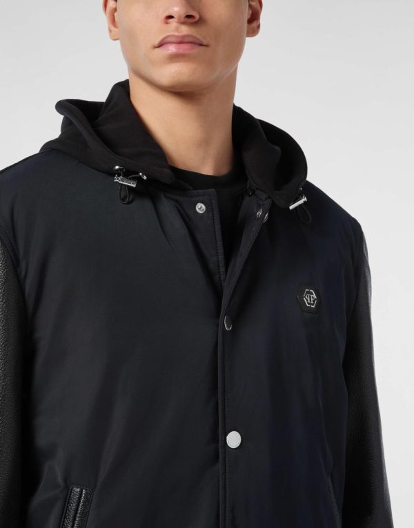 Add something unique and distinctive to your wardrobe. We suggest this wool and nappa varsity hoodie jacket.