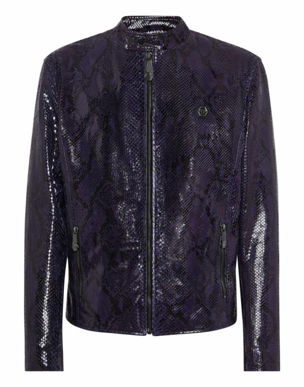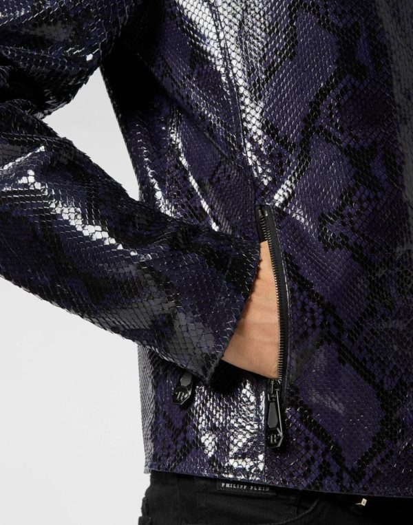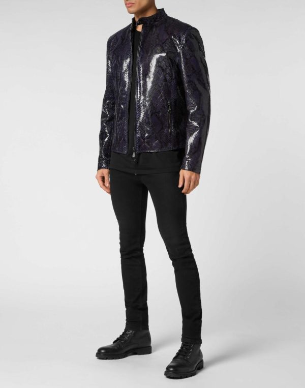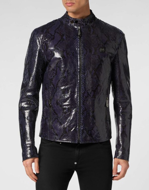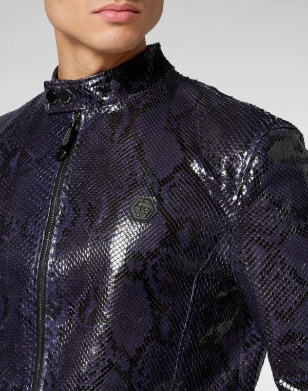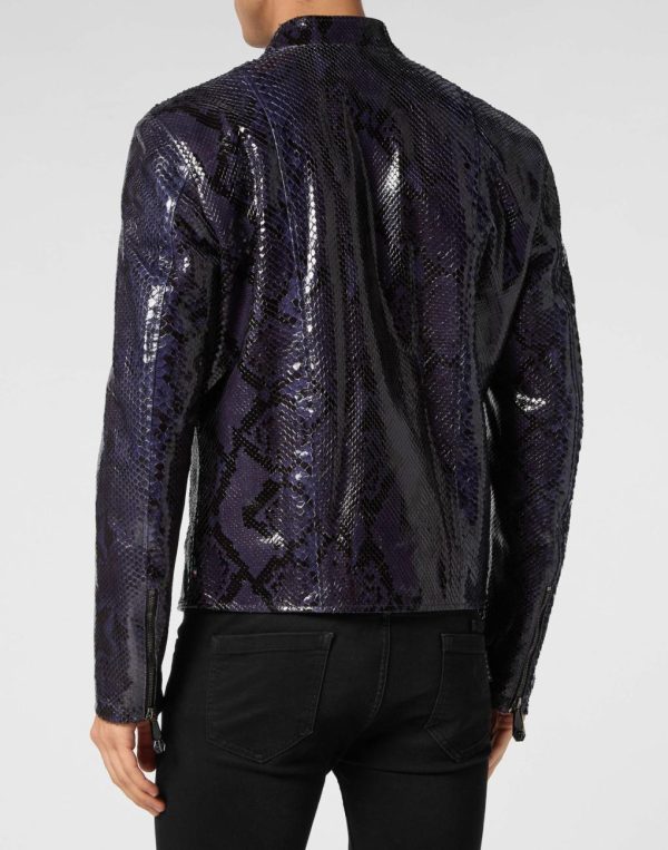 Discover the sophisticated elegance of this python skin biker jacket.