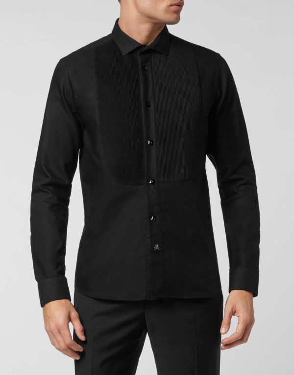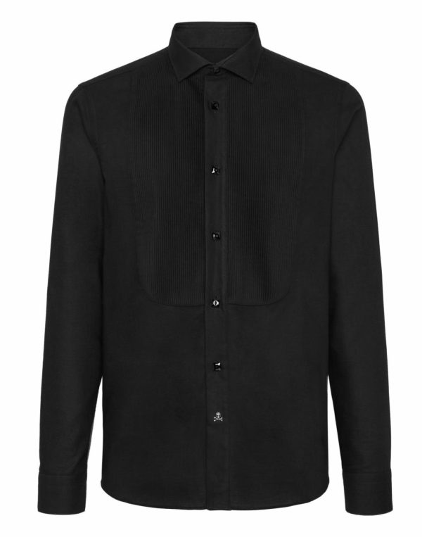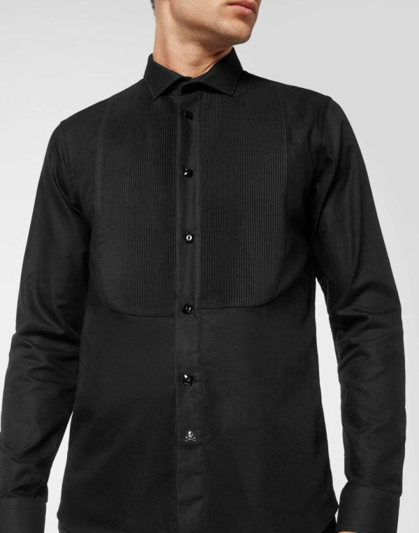 Revolutionize your elegance for special events with this cotton brilliantine evening shirt. See our care for details in the small leaf collar, the pleated bib and the Swarovski buttons. Rounded bottom. Rear side pleats.