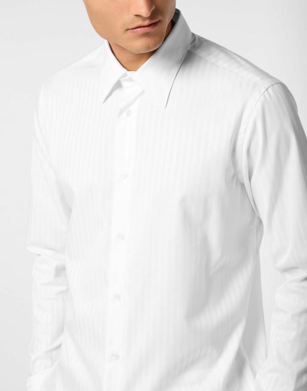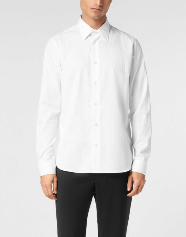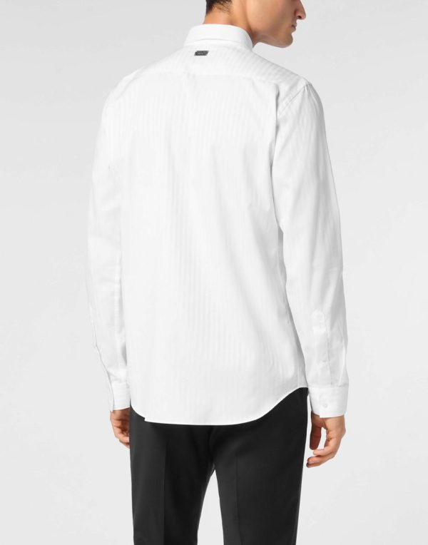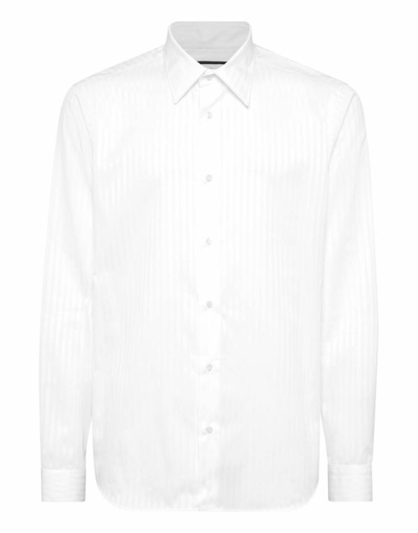 The pinstriped shirt is a timeless must-have. This is Plein’s version.
