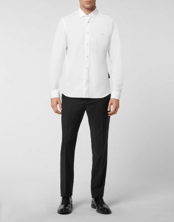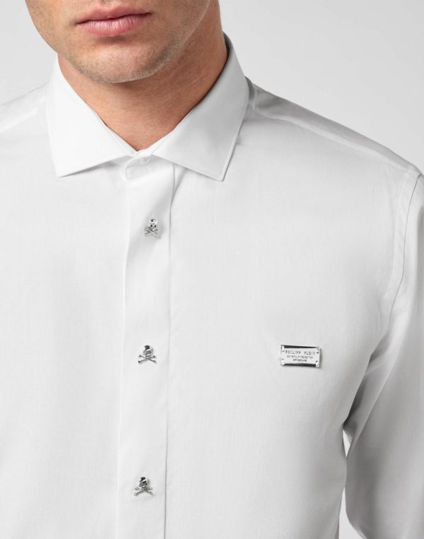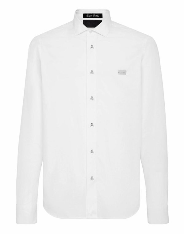 Elevate your style with this sophisticated cotton poplin shirt featuring a sleek hidden placket design. The distinctive box pleat is accentuated with intricate Skull&Bones stud detailing for an edgy luxury statement. A premium logoed metal badge meticulously sewn at the left chest confirms this exclusive Limited Edition status. Features a classic spread collar and contemporary rounded bottom hem. Fit: Sugar Daddy.