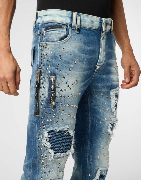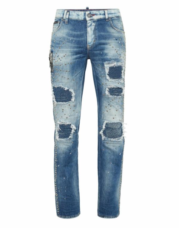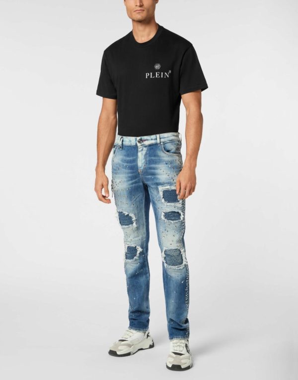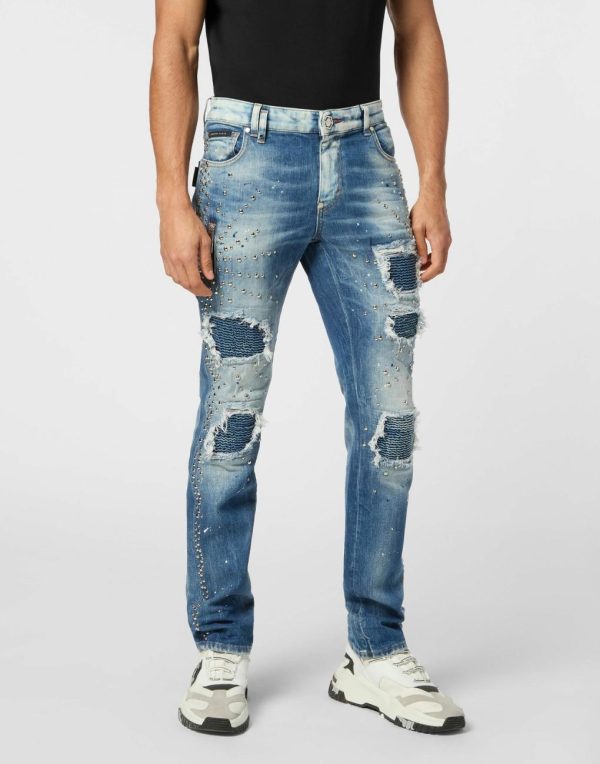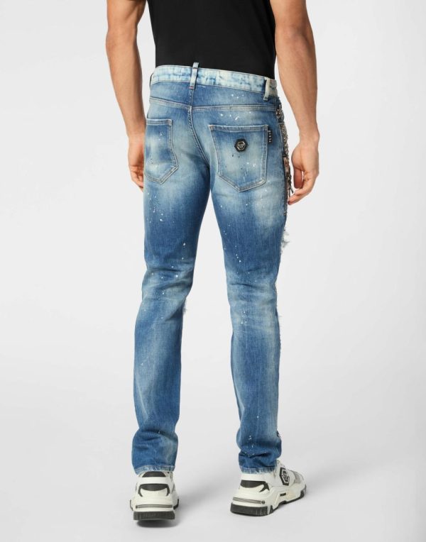 Elevate your streetwear collection with these premium distressed denim jeans featuring signature Philipp Plein luxury details.