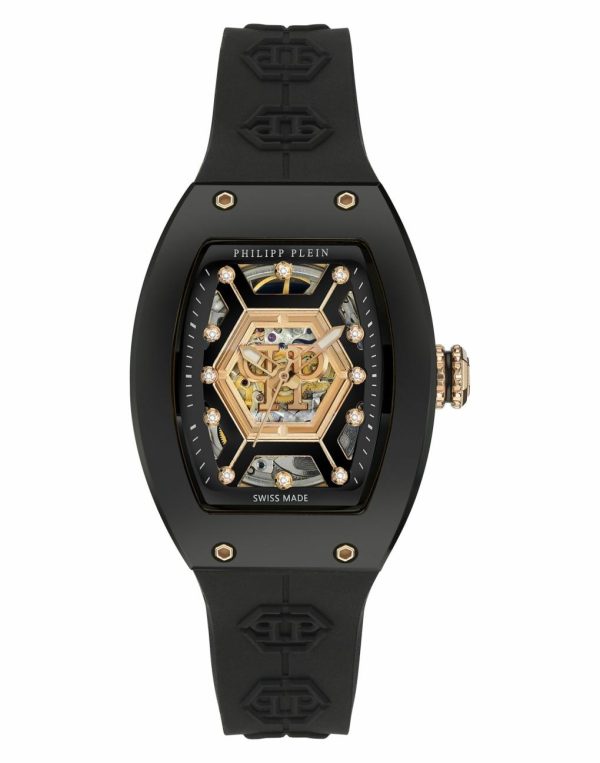 Featuring a sleek, sophisticated profile, the NOIRE GALAXY makes a powerful statement with its all-black aesthetic and PHILIPP PLEIN’s signature Hexagon motif visible through the transparent dial. The watch face showcases exquisite craftsmanship with a luxurious design enhanced by brilliant cut diamonds marking each hour. This elegant women’s timepiece combines exceptional durability with premium performance, powered by precise Swiss Made automatic movement for reliable timekeeping.