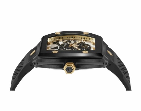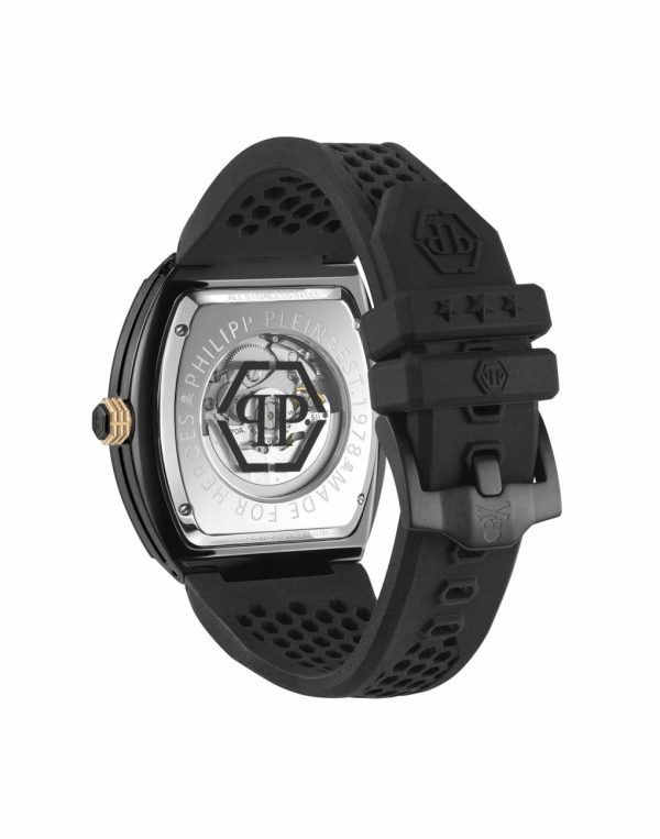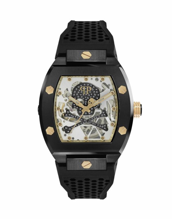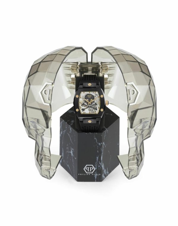 THE $KELETON collection draws inspiration from the iconic Skeleton sneakers, blending premium watchmaking craftsmanship with cutting-edge design. This exceptional timepiece features an exposed automatic movement that showcases the intricate mechanics, complemented by a futuristic 3D-printed hexagonal perforated strap. The distinctive skull motif at 6 o’clock and bold Philipp Plein branding at 12 o’clock create a powerful statement piece that merges edgy style with sophisticated horology. Make a bold impression with this extraordinary Philipp Plein creation.
