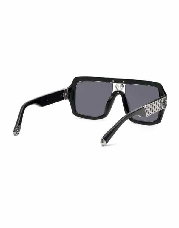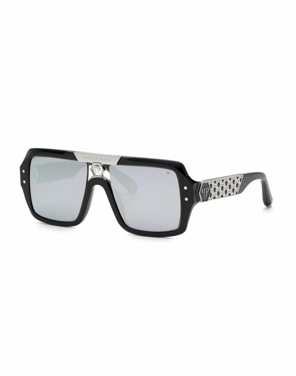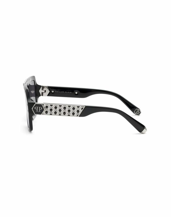Sophisticated acetate frame featuring premium metal components finished in luxurious 23KT gold plating. Bold square front silhouette with distinctive engraved logo on metal bar. Signature hexagonal PP metal emblem accents the bridge area for unmistakable designer appeal.