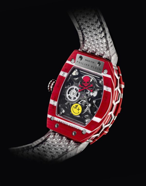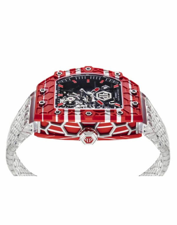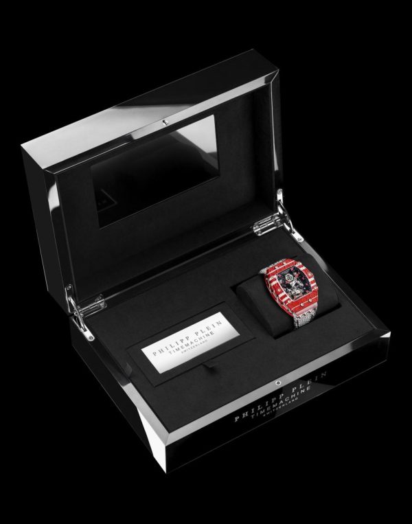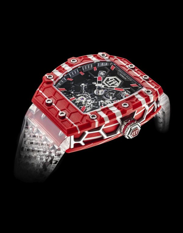 The watch boasts a lightweight yet incredibly strong tonneau-shaped case of 55 x 46 mm, forged from cutting-edge forged carbon. This high-tech material offers exceptional strength and it’s enriched by the elevated branding elements that make this Timemachine unique and recognizable: the PHILIPP PLEIN signature Hexagon motif.