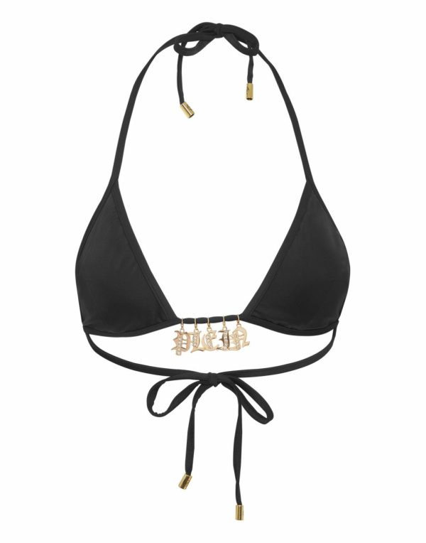 Lycra triangle bikini top with a front plaque branded “PLEIN” and metallic logo cord ends
