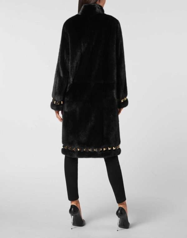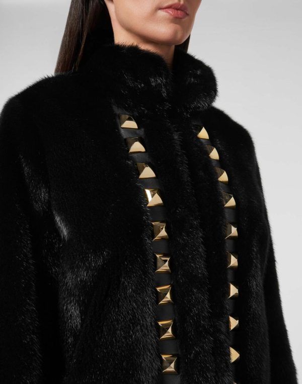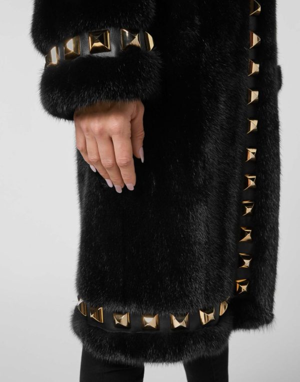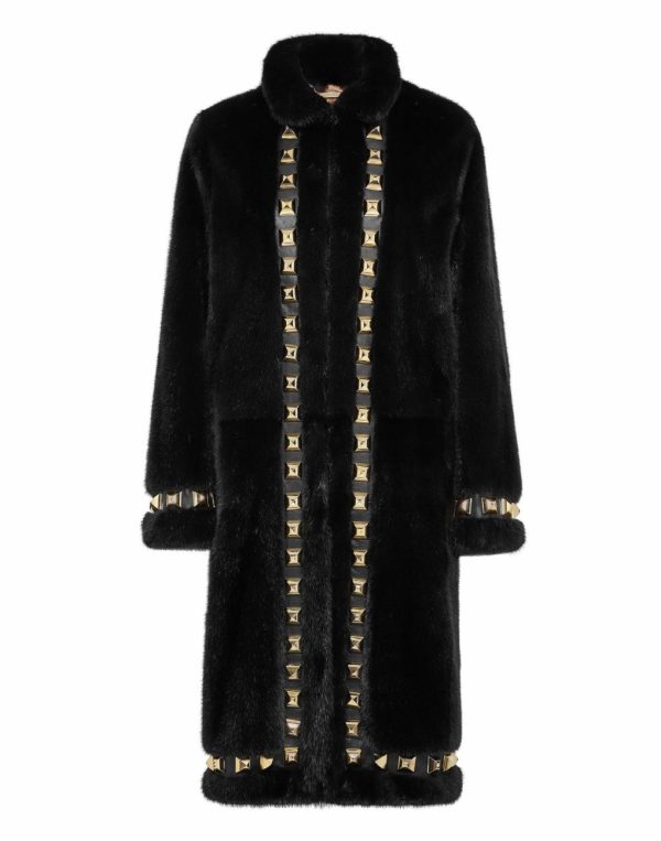 Rock and luxury are the key elements of this mink fur coat decorated with large pyramid studs. It features two slit pockets and a concealed hook fastening. Dappled lining.