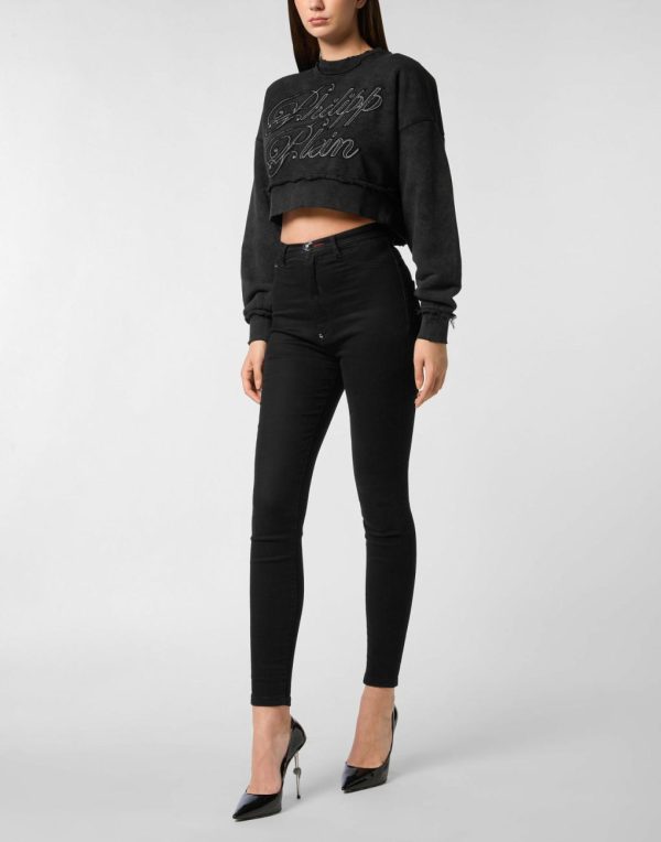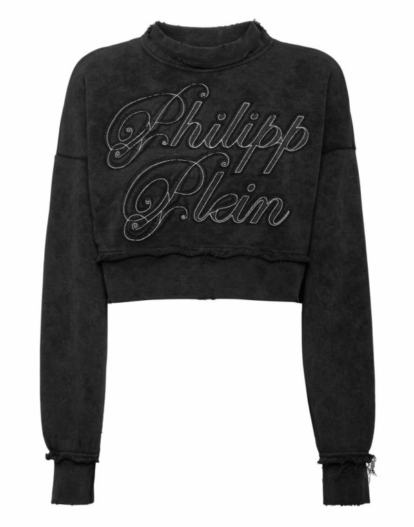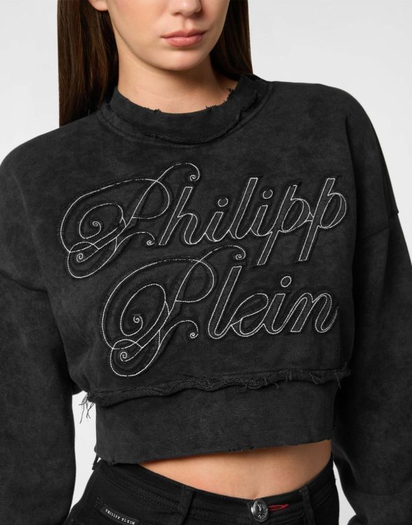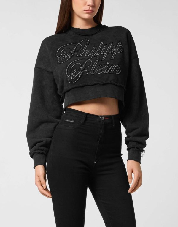 Women Philipp Plein Jogging | Cropped Round Neck Sweatshirt Patch Signature Black