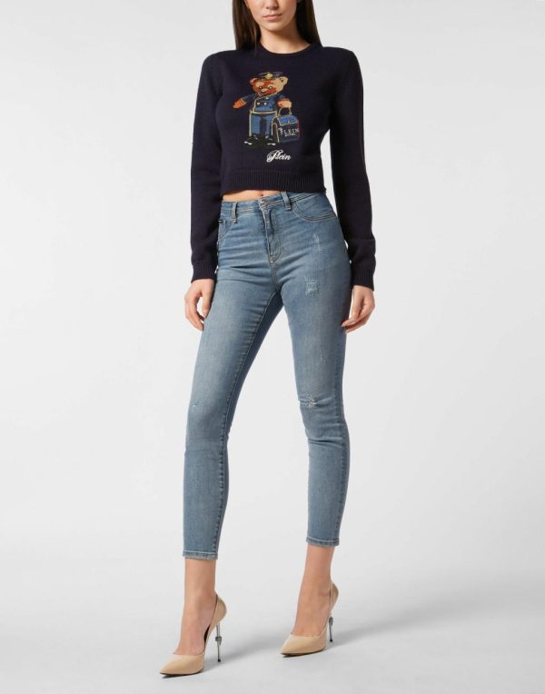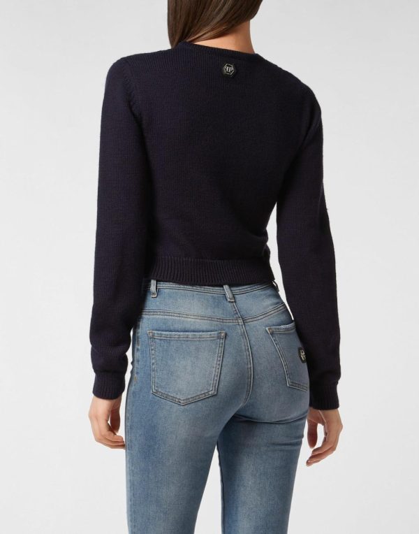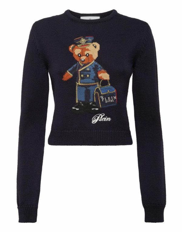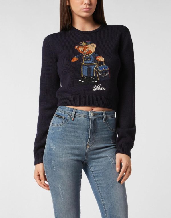 Women Philipp Plein Knitwear | Cropped Round Neck Pullover Teddy Doorman Navy