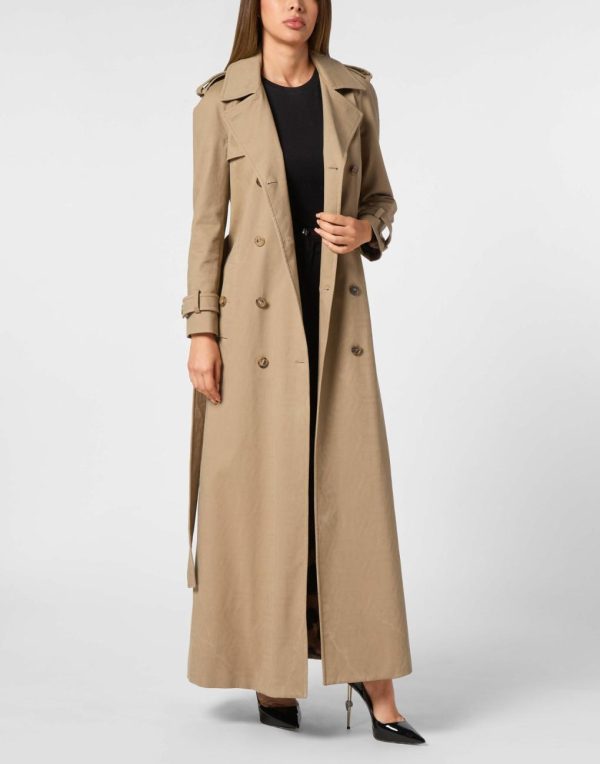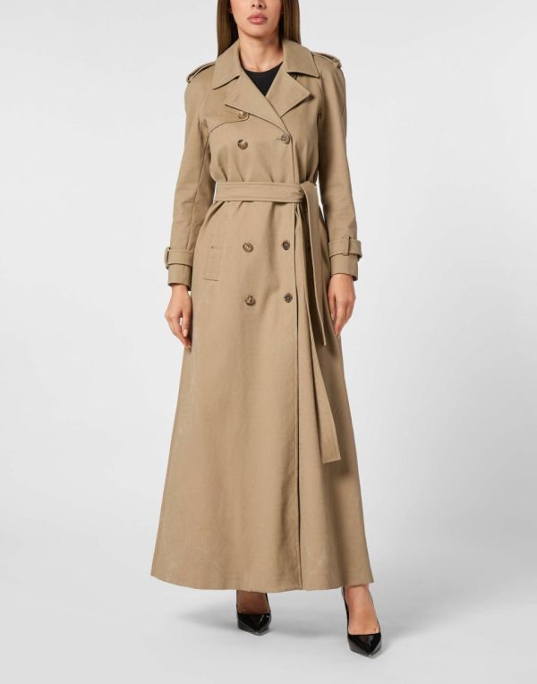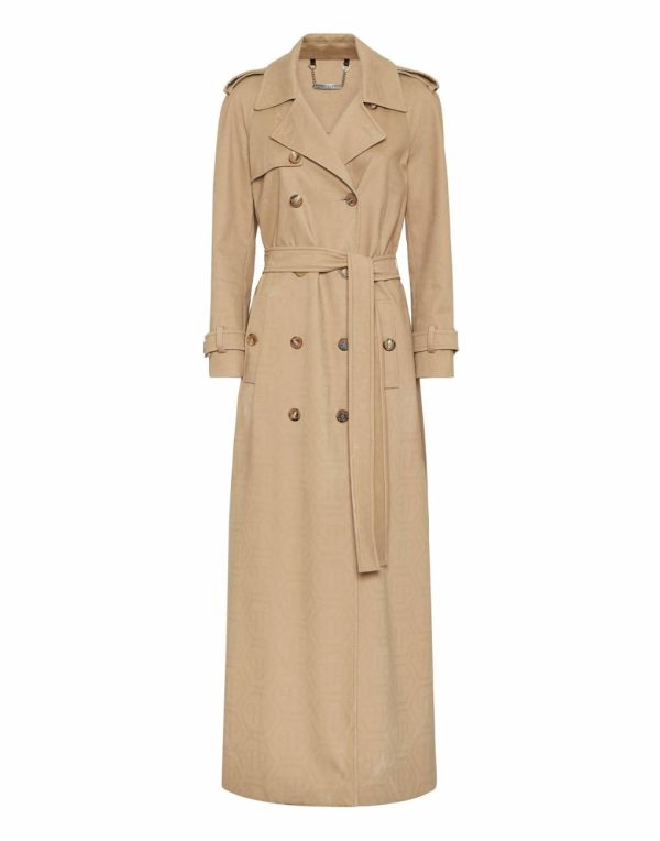 Women Philipp Plein Outerwear | Long Trench Coat Monogram Beige