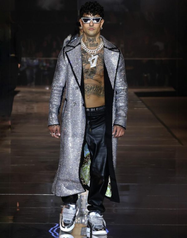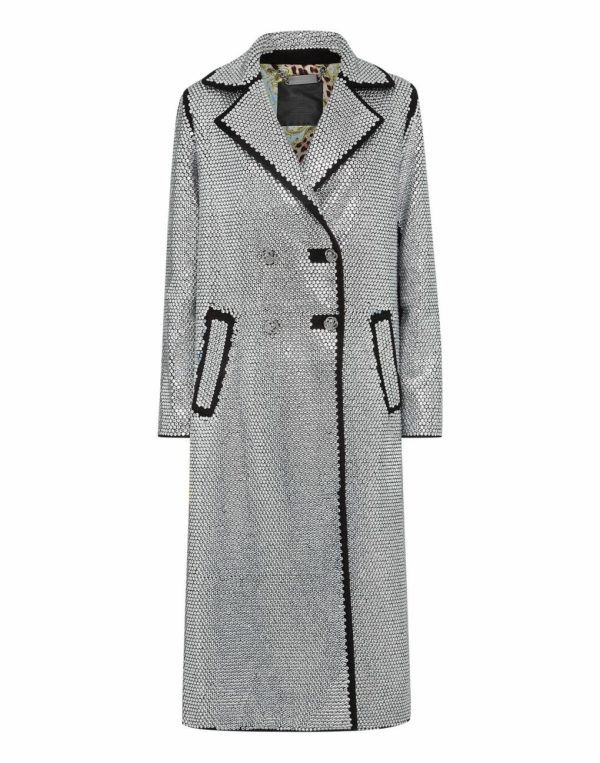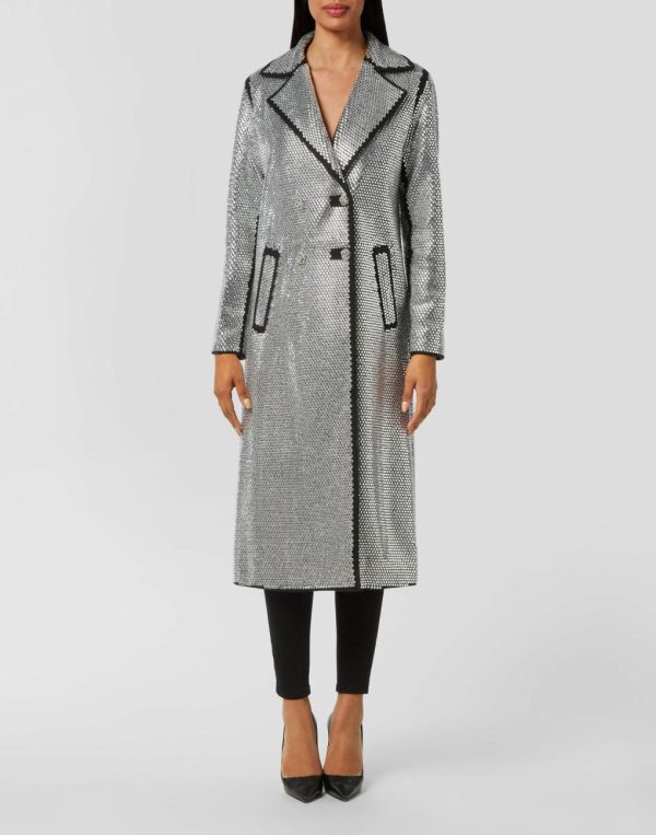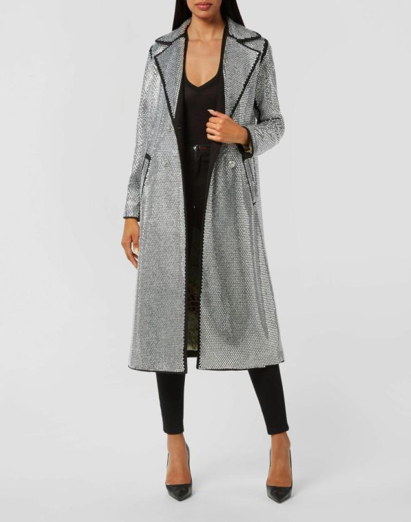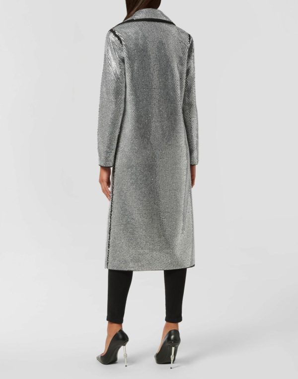 Unleash your inner glamour with this stunning rhinestone-encrusted wool blend long coat featuring exquisite jeweled buttons, practical welt pockets, and a beautifully printed lining for added sophistication.