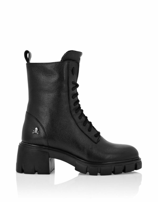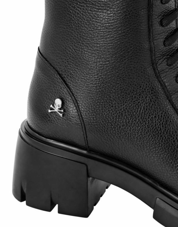 Stylish deer-print leather combat boots featuring a rugged lace-up design with metal eyelets. The iconic Skull&bones motif makes a bold statement on the outer shaft. Built with a durable rubber lug sole for superior traction and leather lining for comfortable wear.